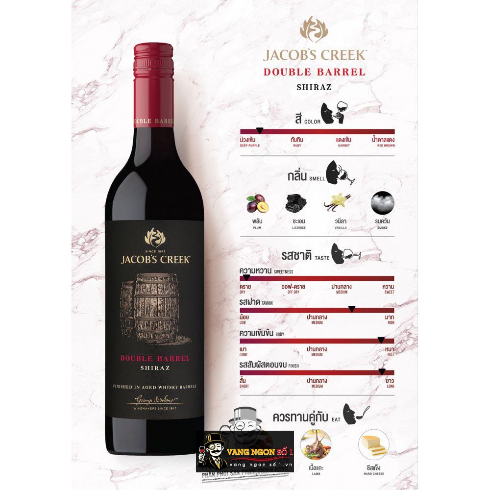 Thời gian ủ trong thùng gỗ sồi Pháp và Mỹ đã mang lại hương khói và vani nhẹ nhàng cho rượu. Vang nhập Jacob's Creek Double Barrel Shiraz thích hợp với các món bò phi lê cao cấp, các loại thịt nướng béo ngậy.