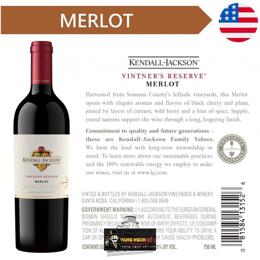 Dòng rượu vang đỏ Kendall Jackson Vintners Reserve này trưởng thành từ nhiều trái nho phong phú khác nhau. Dấu ấn của tannin làm tăng độ quyến rũ cho rượu vang có điểm kết thúc lâu dài này. Mùi thơm trở nên phát triển hơn cùng điểm cuối trong kết cấu rượu. Zinfandel Mendocino/ Cabernet Sauvignon/Merlot Sonoma là ba loại nho dùng trong ba loại vang đỏ khác nhau.