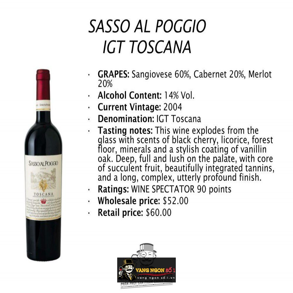 Vangngonso1 chuyên bán rượu vang ngon nhập khẩu cao cấp, mang đến cho quý khách hàng những trải nghiệm tuyệt vời về chất lượng khi thưởng thức rượu vang. Với hơn 20 năm kinh nghiệm bán rượu, vangngon tự hào là điểm đến lý tưởng cho những ai yêu thích rượu vang đậm đà. Bạn đang tìm kiếm một chai rượu vang chất lượng cao với hương vị tuyệt đỉnh thì Rượu vang Piccini Sasso al Poggio Toscana IGT chính là lựa chọn hàng đầu dành cho quý khách yêu rượu.