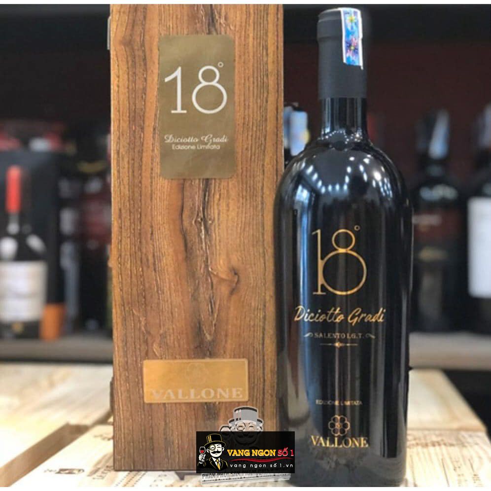 Vang ý DICIOTTO GRADI VALLONE 18 ĐỘ là dòng rượu vang được làm từ những giống nho ngon nhất khu vực Salento, những giống vang đỏ nổi tiếng tạo nên tên tuổi của những chai rượu vang nơi đây là NEGROAMARO, PRIMITIVO, Sự pha trộn hoàn hảo giữa hai giống nho này là tiền đề cho thành công của những chai rượu vang cực chất lượng
