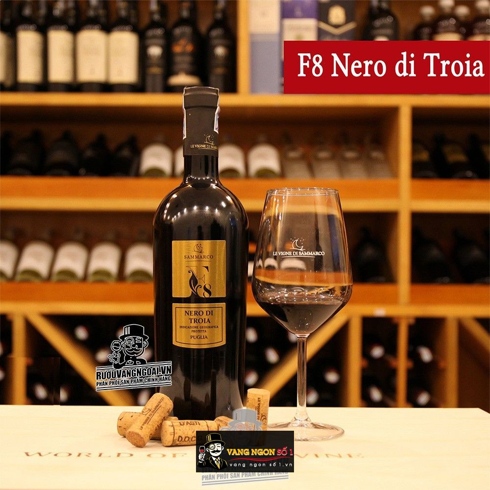 Vang Ý F8 Nero Di Troia có hương vị của hoa quả chín đỏ, hương cao cấp của khói thuốc, da thuộc, gỗ sồi, vị hơi cay của quế..