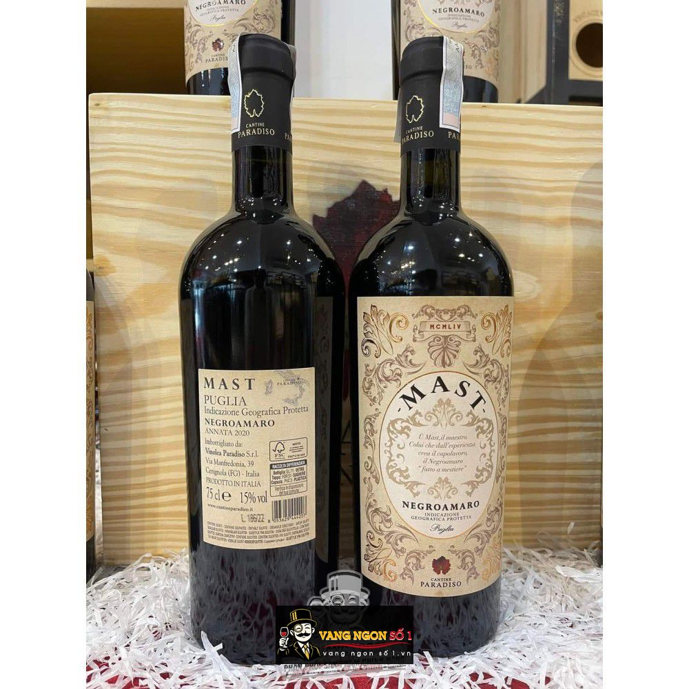 Vang MAST NEGROAMARO là một trong những sản phẩm có chất lượng ngon nhất của nhà sản xuất Cantine Paradiso, Vang ý MAST được làm từ những trái nho Negroamaro, những cây nho được trồng, và chăm sóc kì công trên 35 năm tuổi. Cùng với khí hậu thuận lợi ở phía nam Italia, kết hợp với thổ nhưỡng chủ yếu là đất sét, đá vôi pha sỏi, do đó nho ở đây luôn có chất lượng tốt vượt trội, cùng với cách làm vang truyền thống, đã tạo ra những siêu phẩm rượu vang, thậm chí mang tính biểu tượng cho chất lượng ở khu vực phía nam nước Ý.