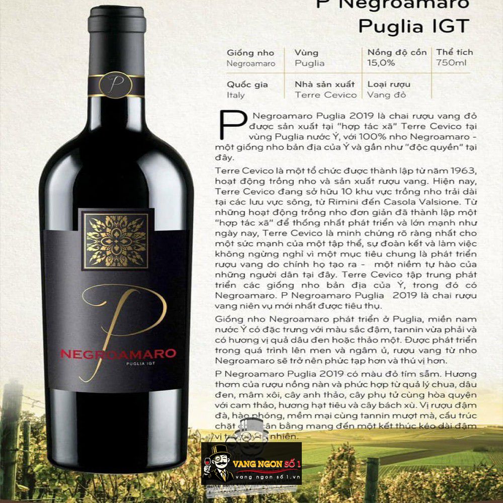 Vangngonso1 chuyên phân phối rượu vang ngon nhập khẩu cao cấp, mang đến cho quý khách hàng những trải nghiệm tuyệt vời về sự tinh tế khi thưởng thức rượu vang. Với hơn 20 năm kinh nghiệm bán rượu, Vang ngon số 1 tự hào là điểm đến lý tưởng cho những ai yêu thích rượu vang đậm đà. Bạn đang tìm kiếm một chai rượu vang nhập khẩu giá hợp lý với hương vị đậm đà và sâu sắc thì Rượu Vang Ý P Negroamaro Puglia 2020 uống ngon chính là lựa chọn hoàn hảo nhất dành cho quý vị yêu rượu.