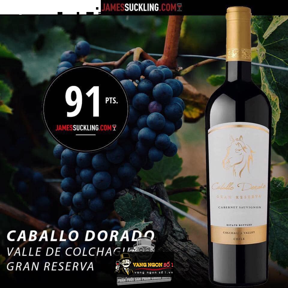 Vang Chile Caballo Dorado Reserva Cabernet Sauvignon thuộc dòng cao cấp hơn dòng vang Cabernet Sauvignon thường. Rượu được làm từ 100% nho Cabernet Sauvignon hảo hạng. Vang đỏ Caballo Dorado Reserva Cabernet Sauvignon có màu đỏ ruby đậm. Hương thơm nồng nàn đến từ mận chín, mâm xôi quyện cùng da thuộc, thuốc lá và tuyết tùng nhẹ nhàng.