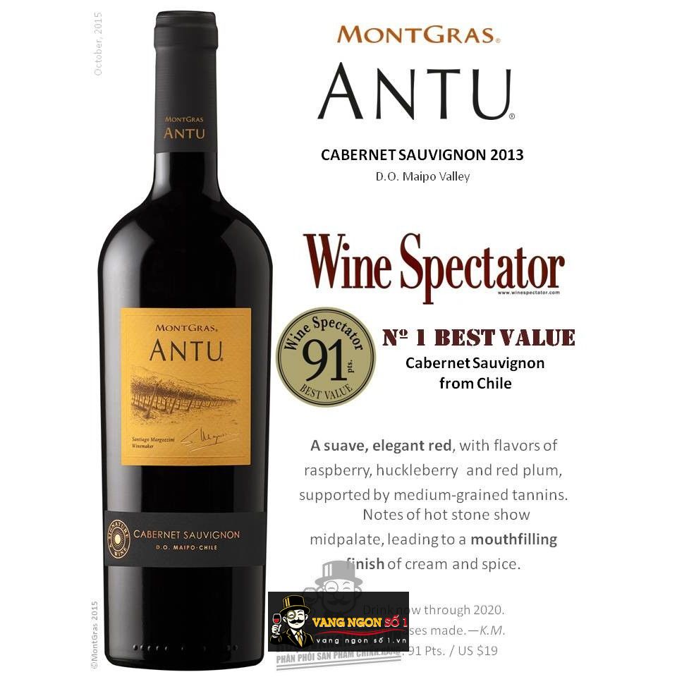 Vangngon chuyên phân phối rượu vang ngon nhập khẩu chính hãng, mang lại cho quý khách hàng những trải nghiệm đẳng cấp về sự tinh tế khi mua rượu vang. Với nhiều năm kinh nghiệm bán rượu, Vang ngon số 1 tự tin là điểm bán lý tưởng cho thực khách yêu thích rượu đậm đà. Quý khách đang tìm mua một chai rượu vang ngoại nhập với hương vị đỉnh cao thì Vang Chile Montgras ANTU Cabernet Sauvignon chính là lựa chọn số 1 dành cho quý vị yêu thích rượu vang.