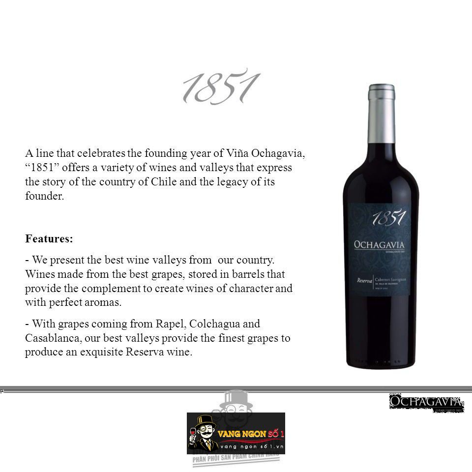 Vang ngon số 1 Việt Nam chuyên bán các loại vang nhập khẩu cao cấp, đem lại cho quý vị những trải nghiệm tuyệt vời về chất lượng khi thưởng thức rượu vang. Với hơn 20 năm kinh nghiệm bán rượu vang, vangngon tự hào là nơi bán lý tưởng cho những ai yêu thích rượu vang tinh tế. Bạn đang muốn đặt mua một chai rượu vang ngoại với hương vị tuyệt đỉnh thì Vang Chile OCHAGAVIA 1851 Cabernet Sauvignon chính là lựa chọn hàng đầu dành cho quý khách đam mê rượu.