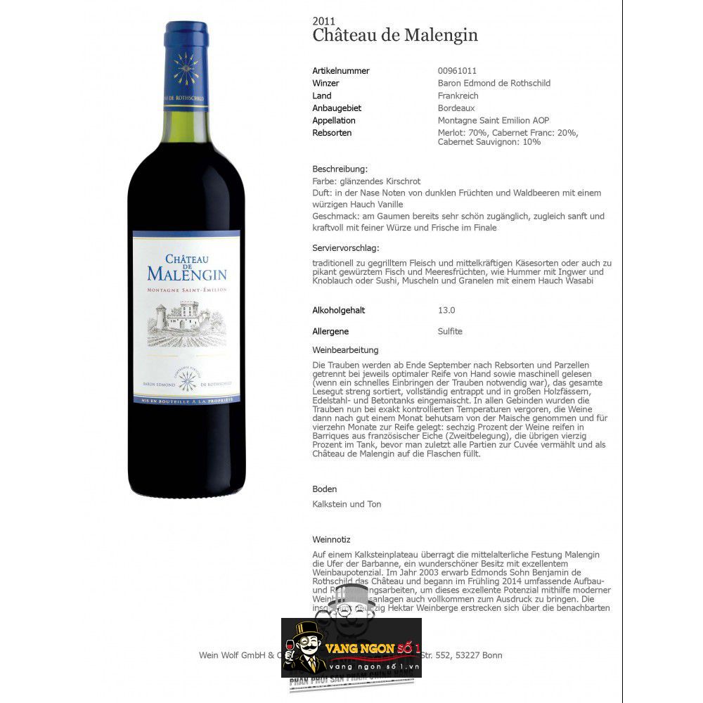 Chateau de Malengin Montagne Saint Emilion nơi sản xuất ra rượu Chateau de Malengin là một vùng làm rượu vang đỏ nổi tiếng ở Pháp. Chúng thu thập hầu hết các loại giống nho của Bordeaux để trồng và sản xuất những chai rượu ngon có danh tiếng cho thế giới.