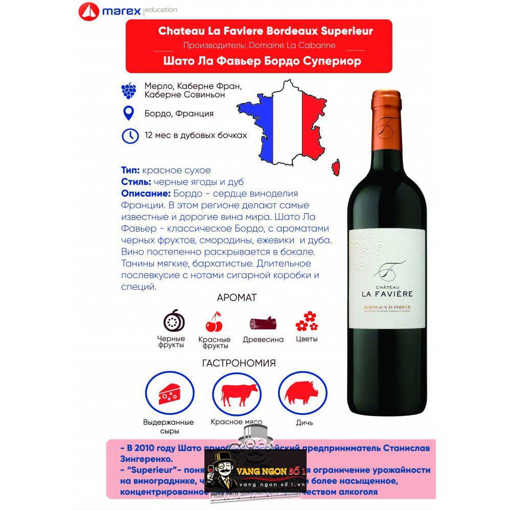 Độ ngon ngọt của lượng trái cây trong vang đỏ Chateau La Faviere Bordeaux Superieur tạo nên tính cách cá tính. Dòng rượu vang đỏ trưởng thành từ trái nho Merlot và Cabernet Sauvignon kết hợp. Vang hài hòa hơn nhờ những mùi thơm phát triển trên vòm miệng sau khi trưởng thành 18 tháng ở gỗ sồi mới của Pháp.