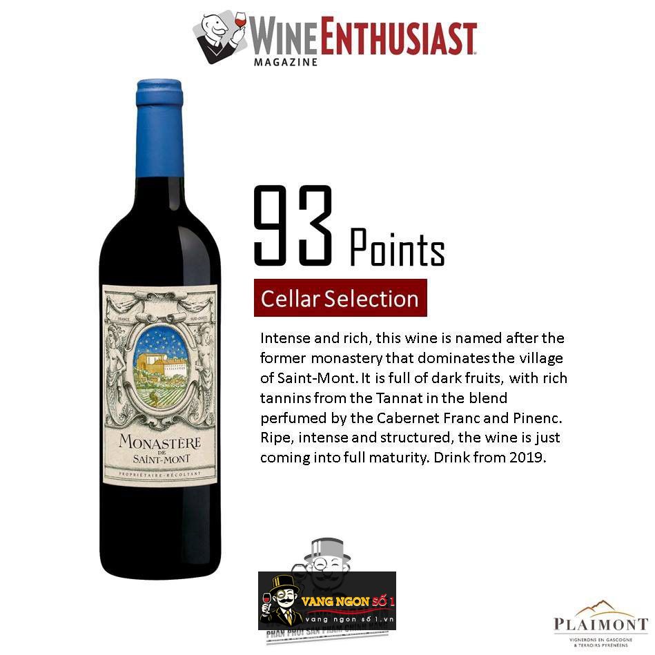 Rượu vang đỏ Monastere de Saint Mont Plaimont được nhà sản xuất vang làm nên hương vị năm 1979. Những mùi thơm trong hầm rượu trưởng thành từ cây nho đỏ trong vườn Saint Mont khô. Sự ngọt ngào của loại rượu đỏ có cấu trúc hài hòa này làm nên ấn tượng của nho đỏ cổ điển.