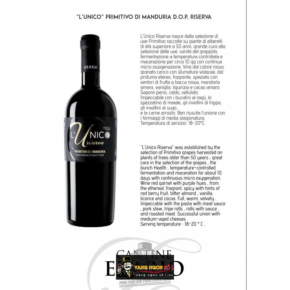 LUnico Riserva là chai rượu vang hiện đại thơm ngon tuyệt vời của Erario. Chai rượu này đã trở thành một dấu mốc thành công từ những thử nghiệm và thách thức mới mẻ từ những nhà sáng lập. Rượu là minh chứng cho chất lượng của thế hệ rượu vang mới của dòng rượu Erario Primitivo Di Mandura. Chai rượu LUnico Riserva này được đánh giá có hương vị mãnh liệt và đậm đà hơn những chai rượu tiền nhiệm.
