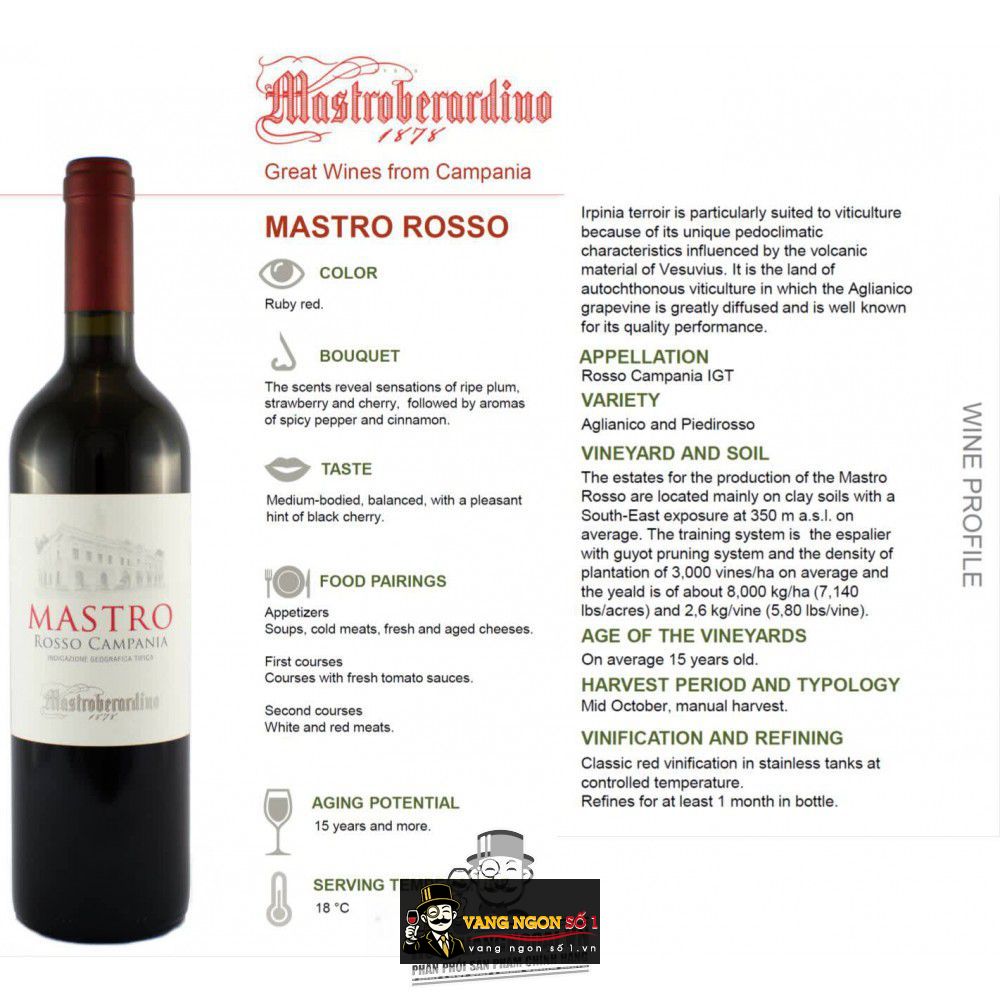 Khu vực Campania đặc biệt thích hợp với nghề trồng nho nhờ đặc điểm giống cây trồng và đất giàu nguyên tố khoáng có nguồn gốc núi lửa, do ảnh hưởng của Vesuvius. Đây là vùng đất của nghề trồng nho bản địa, nơi giống nho Aglianico được phổ biến rộng rãi và được biết đến với chất lượng cao.Rượu vang Mastro Rosso Campania Mastroberardinocó màu đỏ ruby. Khi thưởng thức Mastro Rosso Campania Mastroberardino, bạn sẽ cảm có cơ hội trải nghiệm những bất ngờ vô cùng thú vị bởi Mastro Rosso Campania Mastroberardino mang lại thứ hương vị không chỉ đơn giản là một ly rượu vang mà còn là một trải nghiệm hương vị vô cùng đa dạng.Mastro Rosso Campania Mastroberardino mang đến hương trái cây của mận, dâu tây và anh đào, tiếp theo là hương cay của tiêu và quế. Vòm miệng trung bình có độ axit cân bằng, với các nốt anh đào đen. Mastro Rosso Campania Mastroberardino hứa hẹn có thể làm hài lòng ngay cả những thực khách khó tính nhất.