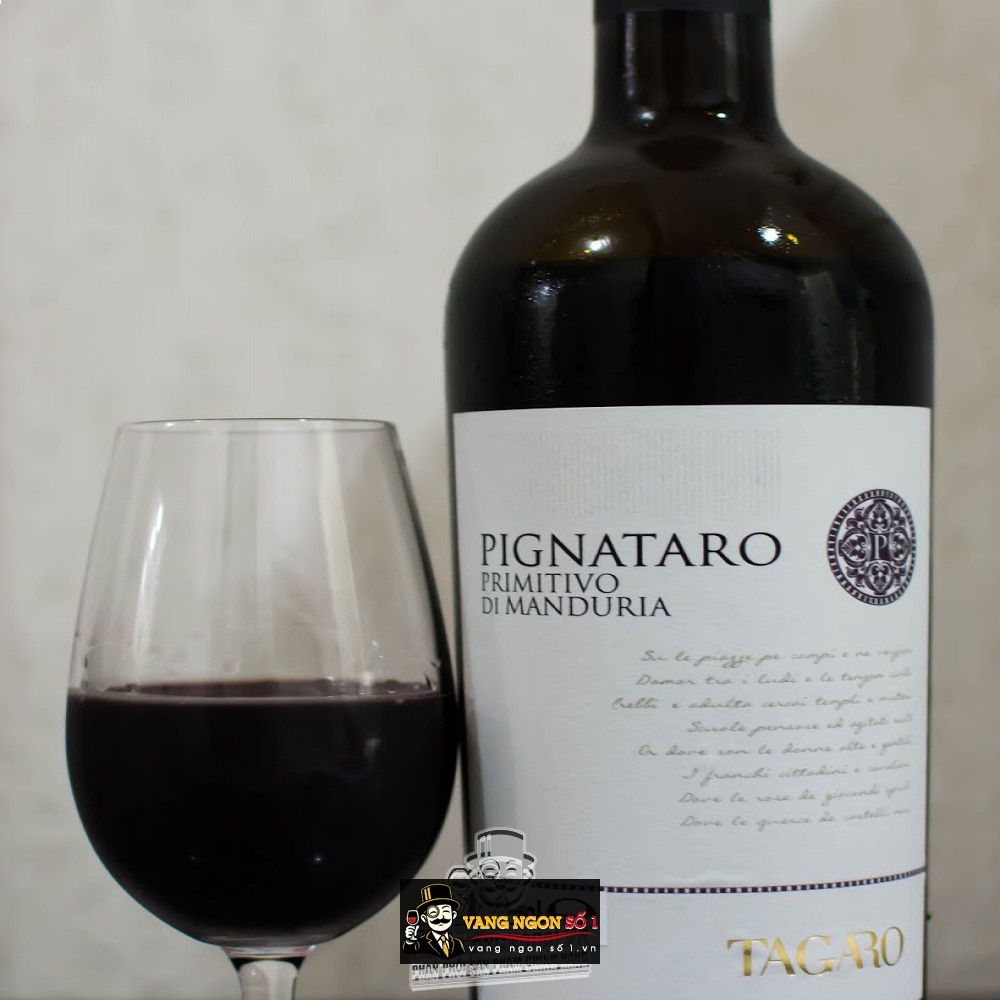 Vị nho Primitivo đầy đặn, tannin đậm đà giúp rượu vang lưu trữ được lâu và chất lượng ổn định qua các năm. Cùng với nồng độ cực kỳ tinh tế, Tagaro Pignataro Primitivo cân bằng với vị tannin dẫn đến một kết thúc tuyệt vời và mỹ mãn. Vang có thể chiều lòng bất cứ vị khách, khiến chúng ta khó mà dứt ra được một khi đã lỡ thưởng thức.
