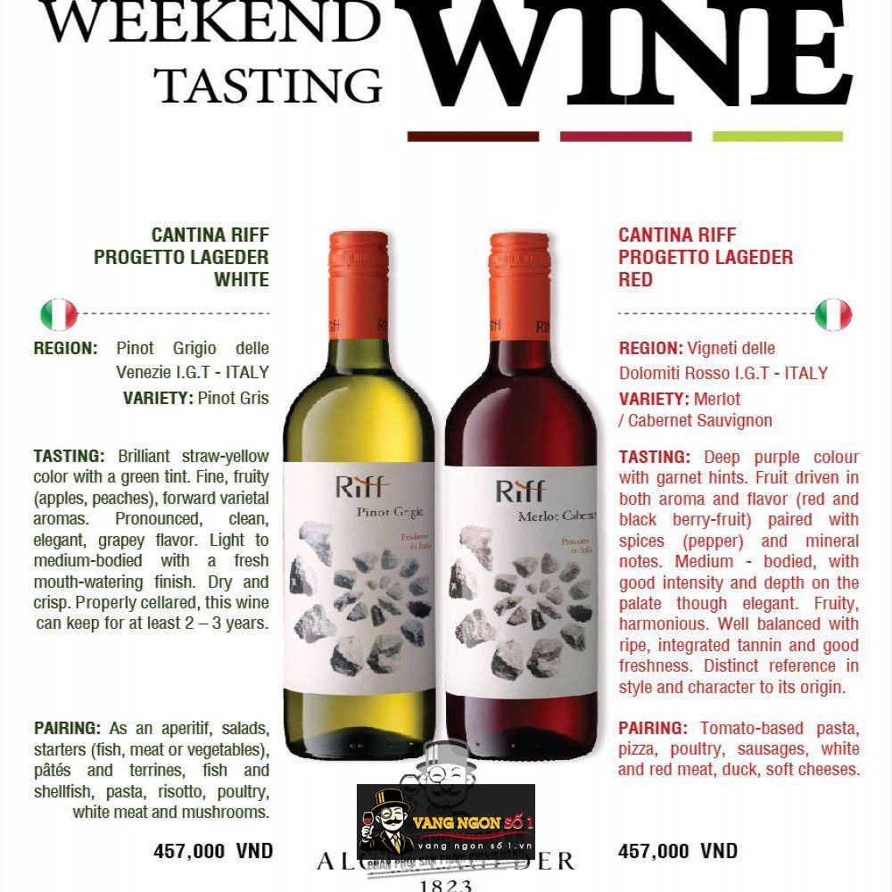 Vang ngon số 1 Việt Nam là shop bán hàng hàng đầu khi bạn muốn mua các loại rượu ngon. Hãy mua luôn Vang Ý Riff Merlot Cabernet Progetto Lageder uống ngon để được giá rẻ nhất với chính sách giao rượu free mọi miền.